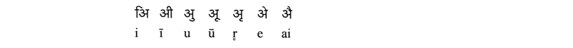| ū | uː | ऊ | कू | ঊ | কূ | ਊ | ਕੂ | ઊ | કૂ | ଊ | କୂ | ஊ | கூ | ఊ | కూ | ಊ | ಕೂ | ഊ | കൂ | ඌ | කූ | – | - |