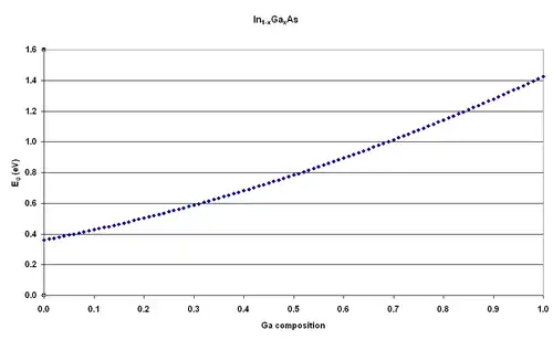 Je nach Mischungsverhältnis der beiden Ausgangssubstanzen, es wird dafür eine Schreibweise der Form In1−XGaXAs verwendet, wobei X das Mischungsverhältnis angibt, lassen sich im Rahmen der Produktion des Werkstoffes die optischen Eigenschaften über die Veränderung der Bandlücke verändern, wie in nebenstehender Abbildung dargestellt. Mit dem Wert X=0,47 ist Indiumgalliumarsenid unter der CAS-Nummer 106097-59-0 handelsüblich, es lassen sich aber beliebige andere Mischungsverhältnisse herstellen. Mit X=0 ist es reines Indiumarsenid mit einem Bandabstand von 0,34 eV bei 300 K bis X=1 für reines Galliumarsenid mit einem Bandabstand von 1,42 eV.[1]