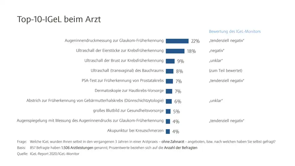 Eine bevölkerungsrepräsentativ quotierte Onlinebefragung im Auftrag des damaligen Medizinischen Dienstes des Spitzenverbandes Bund der Krankenkassen e. V. (MDS) ergab Anfang 2020, dass die Augeninnendruckmessung zur Glaukom-Früherkennung sowie der Ultraschall der Eierstöcke und der Brust zur Krebsfrüherkennung die drei häufigsten IGeL sind. Acht von zehn IGeL wurden von den Ärztinnen und Ärzten angeboten, nur bei zwei von zehn IGeL haben Patientinnen und Patienten selbst danach gefragt. Befragt wurden 2.266 gesetzlich versicherte Personen im Alter von 20 bis 69 Jahren.[9]