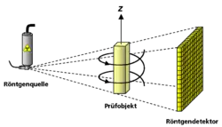 Hier wird das gesamte Volumen eines Objekts durch allseitiges Durchstrahlen untersucht. Die Röntgenquelle sendet einen Kegelstrahl aus, detektiert wird mit einem Flachbild-Detektor (flat panel, Flächendetektor).