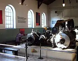 Ab 1804 wurden durch Arthur Woolf wieder Verbunddampfmaschinen produziert und weiterentwickelt. Beiträge verschiedener Ingenieure führten in den nachfolgenden Jahrzehnten zu weiteren Verbesserungen und damit auch einer Ausweitung der Anwendungsgebiete. Parallel dazu wurden ebenso Wasserkraftanlagen und Windmühlen ausgebaut und auch technisch weiter verbessert. Die massenhafte Verbreitung der Dampfmaschine erfolgte selbst in England, dem Mutterland der Industrialisierung, erst ab den 1860er Jahren. In anderen Staaten wie Frankreich oder den USA, wo die Wasserkraft eine große Rolle spielte, erfolgte die weite Verbreitung erst ab den 1870er Jahren.[37] Anschließend wurde die Dampfmaschine zur wichtigsten Arbeitsmaschine in verschiedensten Bereichen und wurde unter anderem zum Antrieb von Pumpen, Hämmern, Gebläsen und Walzen genutzt.