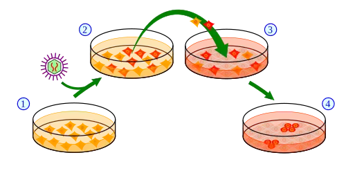 2) Einbringen der Pluripotenzgene in die Zellen durch einen Retrovirus-Vektor. Zellen, die die exogenen Gene exprimieren sind rot eingezeichnet