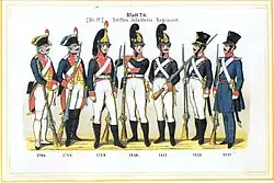 - 1814: Rock wie bisher, aber weißes Futter und grüne wollene Epauletten. Schwarzer Tschako mit weißem Stutz, stahlblauem Wappen und Schuppenketten.