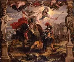 Achilleus treibt die Troer über den Fluss Xanthos (beziehungsweise Skamandros), fängt zwölf von ihnen für Patroklos Feuerbestattung und tötet weitere im Flussbett, darunter den vormals verschonten und diesmal vergeblich um Schonung flehenden Lykaon. Achilleus reizt den Flussgott, indem er dessen Leiche in ihn wirft, ihn mit weiteren Toten füllt und so am Fließen hindert. Daraufhin bittet der Fluss Achilleus, damit aufzuhören, doch letzterer weigert sich und wird daraufhin vom Fluss angegriffen. Dem Verzweifelten helfen zwar Poseidon und Athene, der Skamandros ruft allerdings den Simoeis zur Unterstützung. Erst der von Hera geschickte Hephaistos kann den Fluss durch sein Feuer bändigen. Im Anschluss daran kommt es zum Kampf der Götter untereinander, über den sich Zeus freut.[40] Athene besiegt dabei Ares und Aphrodite – sie weint sich später bei Zeus aus –, Hera triumphiert über Artemis und Apollon will nicht gegen seinen Onkel Poseidon kämpfen, wofür er von Artemis und Hera getadelt wird. Auch Hermes will nicht kämpfen. Während die anderen Götter zum Olymp zurückkehren, bleibt Apollon zum Schutz vor Ilios. Er lockt Achilleus in Gestalt des Agenors von Ilios weg, sodass Priamos die Tore zum Empfang der Troer öffnen kann.