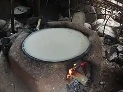 Die Teigmischung wird meist zwei bis drei Tage stehen gelassen, bis sich ein mild-sauerer Geschmack entwickelt. Der Teig enthält soviel Wasser, dass er sich auf die heiße Herdplatte gießen lässt.