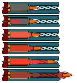 Anschließend erreicht es den gezogenen Teil des Laufes und wird in die Züge gepresst, durch die es den Drall erhält. Je nach Konstruktion kann das Geschoss die Züge bereits erreichen, bevor es vollständig aus der Hülse ausgetreten ist. Erst jetzt kann das Geschoss durch die Arbeitskraft der Pulvergase auf eine Geschwindigkeit gebracht werden, die stark genug ist, einen Gegenimpuls zu erzeugen.[8][9] Diese Gegenkraft der Beschleunigung wird durch die unter hohem Druck stehenden Gase auf den Patronenboden übertragen, wodurch die Rückstoßwirkung der Waffe einsetzt. Sogenannte Rückstoßlader nutzen diese Kraft für die Repetierfunktion der Waffe.[10][11] Wenn das Geschoss die Laufmündung passiert hat, wird es noch über eine kurze Strecke von den noch unter hohem Druck stehenden, nachströmenden Pulvergasen beschleunigt, deren schlagartiger Druckausgleich auf den Luftdruck den Mündungsknall erzeugt.