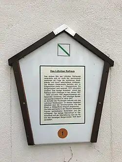 - Der Lehrpfad beginnt am Rathaus. Sein heutiges Aussehen geht auf Umbauten in den Jahren 1867/68 und einer umfassenden Sanierung bis 1997 zurück. Das Renaissanceportal stammt aus dem Jahr 1601 und zeigt im Scheitelpunkt das Wappen der Stadt und darüber das Schönburgische und das Rhein- und Wildgräfliche Wappen.