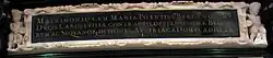 Die 24 lateinischen vergoldeten Inschriften auf schwarzem Marmorgrund fungieren als Überschrift zu dem jeweiligen Bildrelief aus weißem Marmor darunter. Dreizeiligkeit und Großbuchstaben, wobei V für U und die Ligatur Æ für AE geschrieben werden, entsprechen dem Original, das auch für MP und TE Ligaturen verwendet, ebenso die Nummerierung unter den Inschriften. Abkürzungen sind in runden Klammern aufgelöst, notwendige Ergänzungen in eckige Klammern gesetzt. Der Zusammenfassung der einzelnen Inschriften geht jeweils die Jahreszahl voraus, die der zeitlichen Einordnung der erwähnten Geschehnisse dient. Den rahmenden Schmuck der Inschriften bilden querrechteckige Kartuschen aus weißem Marmor, beidseitig gestützt von einem spielerisch bewegten Putto.