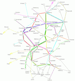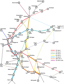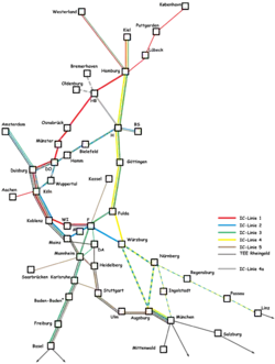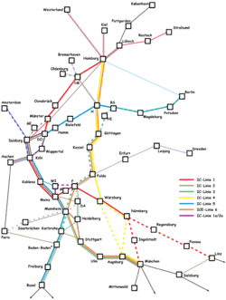 - Linie 1 (rot): Hamburg-Altona – Bremen – Münster – Dortmund – Essen – Duisburg – Düsseldorf – Köln – Bonn – Koblenz – Mainz – Mannheim – Heidelberg – Stuttgart – Ulm – Augsburg – München