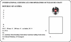 3. a b International Certificate for Operators of Pleasure Craft - Resolution No. 40, Revision 4 and Amendments 1 to 3 (consolidated version), ECE/TRANS/SC.3/147/Rev.4 and Amends. Economic Commission for Europe - Inland Transport Committee, Working Party on Inland Water Transport, 2022.