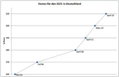 Seit 2002 hat sich der Preis des IELTS-Tests in Deutschland von 123 Euro (240 Deutsche Mark)[8] auf 240 Euro (249 € ab Dezember 2023) verteuert. In der Schweiz ist der Preis für den computerbasierten Test auf aktuell 400 CHF angestiegen (Stand Juli 2023). Es wurde kritisiert, dass deutsche Studienbewerber für den Nachweis ihrer Englischkenntnisse häufig auf IELTS angewiesen sind, da viele Universitäten nur diesen oder den ähnlich teuren TOEFL-Test anerkennen. Damit werden sozial Schwächere durch die hohe Testgebühr benachteiligt, zudem greifen die Universitäten auf einen externen Dienstleister zur Sprachprüfung zurück. Die Universität Hamburg verzichtet für den Anglistik-Bachelor seit Mai 2012 auf Sprachzertifikate externer Anbieter und hat damit „durchweg positive Erfahrungen“ gemacht. So habe die Qualität der Studienbewerber laut Studiendekanin Susanne Rupp nicht nachgelassen.[9]