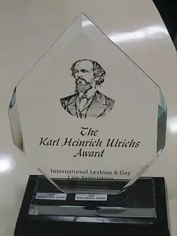 Der Karl Heinrich Ulrichs Award, oder auch kurz Karl Award genannt, ist nach Karl Heinrich Ulrichs benannt, dem ersten offen „urnischen“ Juristen, der 1867 als erster öffentlich die Abschaffung aller gegen „Urninge“ gerichteten Paragrafen vor dem Deutschen Juristentag in München forderte und von Sexologen überhaupt als „erster Schwuler der Weltgeschichte“[2] bezeichnet wird. Beim Zusammentreffen in Turin im Jahre 2002 beschloss das Direktorium, diesen Preis alle drei Jahre an eine lebende oder eine schon verstorbene Person zu verleihen, die im Laufe ihres Lebens einen wichtigen Beitrag zur rechtlichen Gleichstellung von schwulen, lesbischen, bisexuellen oder transgender Personen geleistet hat. Jede Region ist berechtigt, einen Kandidaten zu nominieren. Aus dieser Gruppe wählen die Direktoren, die selbst nicht nominierbar sind, dann den Preisträger aus.