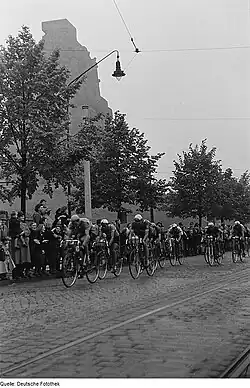 Fahrer, u. a. Gustav Adolf Schur (ganz rechts), beim Etappenstart auf dem Karl-Marx-Platz