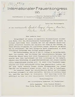 - ↑ Frauenfriedenskongress 1915 Melanchthon Blog, 2023, nach offiziellem deutschen Bericht; auch 100 Jahre Frauenfriedenskongress Emma, vom 28. April 2015, mit vollständigem deutschen Text; vgl. Resolution ( vom 5. Mai 2012 im Internet Archive), WILPF International, mit vollständiger englischer Textfassung