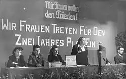 In Westdeutschland veranstalteten Sozialdemokratinnen zwar seit 1948 wieder Frauentage, doch ging die Bedeutung dieses Tages allmählich verloren. Hier war es vor allem das Thema Frieden und der Kampf gegen die Wiederbewaffnung, die auf den Veranstaltungen zum Internationalen Frauentag (terminlich immer irgendwann zwischen Februar und Mai angesiedelt) angesprochen wurden. Gegen die Wiederbewaffnung entwickelte sich ein breites Oppositionsbündnis, das auch von Mitgliedern der SPD, der KPD und der bürgerlichen Parteien, wie vom christlichen Zentrum, getragen wurde. Es waren auch parteilose Christinnen und Pazifistinnen, die die Themen Frieden und Abrüstung mit dem Internationalen Frauentag verbunden haben. Erst mit dem Engagement der neuen Frauenbewegung Ende der 1960er Jahre rückte der 8. März in der Bundesrepublik wieder stärker ins Bewusstsein. Allerdings hatte es die autonome Frauenbewegung in der BRD schwer mit diesem Tag, obwohl 1975 das Internationale Jahr der Frau stattgefunden hatte. So war noch 1977 in der feministischen Zeitung Courage zu lesen: „Nichts gegen einen Feiertag, auch nicht gegen einen Frauentag. Nur muß er von denen, die gefeiert werden, bestimmt und gestaltet werden.“[16] Diese Kritik richtete sich vor allem gegen die Feierpraxis in der DDR, wobei dieser Tag zunehmend als eine Art ‚sozialistischer Muttertag‘ angesehen wurde.[17]