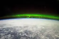 Der tangentiale Blick auf das Polarlicht veranschaulicht die Höhenabhängigkeit des Energieeintrags in die Atmosphäre durch Korpuskularstrahlung.