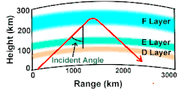 Vertikales Ausbreitungsverhalten zweier Funksignale unterschiedlicher Frequenz. Die niedrigere des rechten Signals wird in der E-Schicht reflektiert, die höhere des linken durchdringt die E-Schicht, bleibt aber niedriger als die kritische Frequenz der F-Schicht, weshalb sie in dieser Schicht reflektiert wird.Flach abgestrahlte Wellen treffen in einiger Entfernung wieder auf den Erdboden