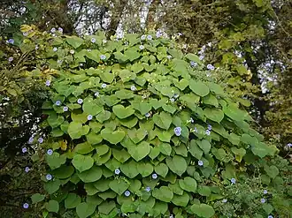 Ipomoea parasitica ist eine klein oder groß wachsende, krautige Kletterpflanze. Die Stängel sind unbehaart oder nahezu unbehaart und weisen auf der Unterseite oftmals warzenähnliche, fleischige Höcker auf. Die Laubblätter sind lang gestielt, die Blattspreiten sind abgerundet herzförmig und 6 bis 10 cm lang. Die Oberseite ist striegelig behaart, die Unterseite ist unbehaart oder nahezu unbehaart. Nach vorn sind sie zugespitzt oder abgerundet und zipfelig.
