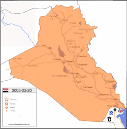 Am 17. März 2003 stellte US-Präsident Bush Saddam Hussein ein Ultimatum, den Irak innerhalb von 48 Stunden zu verlassen, andernfalls würde man den Irak angreifen. Auf Husseins Weigerung hin eröffnete die Kriegskoalition in der Nacht vom 19. zum 20. März den als Operation Iraqi Freedom bezeichneten Krieg mit gezielten Bombardements in Bagdad. Die USA feuerten 40 Marschflugkörper auf das Regierungsviertel in Bagdad und mutmaßliche Aufenthaltsorte Saddam Husseins ab. Diese sogenannte Shock-and-Awe-Kampagne (Schrecken und Furcht) sollte die irakische Kommunikationsinfrastruktur zerstören und die irakischen Truppen demoralisieren.