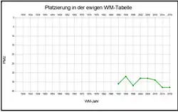 | 13 WM-Spiele 2 Siege 8[1] Unentschieden 3 Niederlagen 10:10 Tore | |