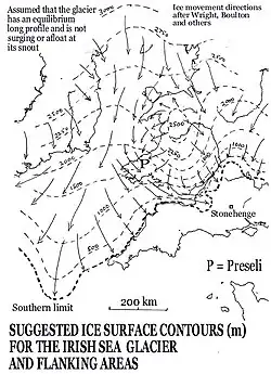 Forschungen von 2007[4] sprechen auch dafür, dass das Gebiet jenseits der South Ireland End Moraine während und nach der letzten großen Vereisung durch einen Irischen Eisschild bedeckt war, genauso wie Teile der Gebiete jenseits der South Wales End Moraine.