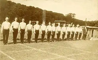 Die niederländische Turnmannschaft bei den Olympischen Spielen 1908 mit Isidor Goudeket (vermutlich Dritter von rechts[1]) | |
