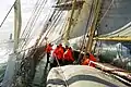 Kennzeichen der zweiten Iskra ist die Takelung mit drei verschiedenen Segeltypen: Barkentinen-typisch Rahsegel am Fock- (vorderer Mast) sowie Gaffelsegel am Großmast (mittlerer Mast), jedoch Bermudasegel statt einer weiteren, typspezifischen, Gaffelbesegelung am Besanmast (hinterer Mast). Die Reihenfolge stellt Stationen der Entwicklungsgeschichte des Segels dar.