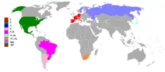 - ↑ Die Platzierungen ab Platz 5 wurden von der FIFA festgelegt, ohne dass es dafür Platzierungsspiele gab. Siehe: All-time FIFA World Cup Ranking 1930–2014 ( des vom 12. August 2014 im Internet Archive) Info: Der Archivlink wurde automatisch eingesetzt und noch nicht geprüft. Bitte prüfe Original- und Archivlink gemäß Anleitung und entferne dann diesen Hinweis. (PDF-Datei; 195 kB)