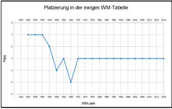 | 83 WM-Spiele 45 Siege 21[1] Unentschieden 17 Niederlagen 128:77 Tore | |