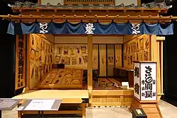 In Akisato Ritōs Werk Tōkaidō Meisho Zue (東海道名所図会, „Illustrierte Sammlung berühmter Orte der Tōkai-Straße“), das im Jahr 1797 veröffentlicht wurde, ist die Buchhandlung von Izumiya Ichibei dargestellt (Bd. 6, S. 74–75).[4] Es handelt sich um eine doppelseitige Illustration von Kitao Masayoshi, welche die bekannten Buchläden der Verleger Masuya (links) und Izumiya Ichibei (rechts) im Viertel Shiba Shimmeimae zeigt. An der gesamten Wand hängen Farbholzschnitte (錦絵, Nishiki-e), auf den Regalen sind illustrierte Bücher aufgereiht.[1] Im Hintergrund lässt sich das Werk Godaime Ichikawa Danjūrō no Shibaraku (五代目市川団十郎の暫, „Ichikawa Danjūrō V. in einer Shibaraku-Rolle“) von Katsukawa Shunkō identifizieren.