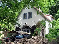 Östlich des Hofensembles steht an der beschädigten östlichen Grundstücksmauer sowie nördlich des Zufahrtswegs durch das östliche Tor die ehemalige Scheune. Dies ebenfalls bereits ältere Bauwerk wurde 1895/96 durch den Baumeister Gustav Röder umgebaut. Der eingeschossige Bau hat ein biberschwanzgedecktes Satteldach mit je einem vierachsigen Dachhaus mit Schleppdach.