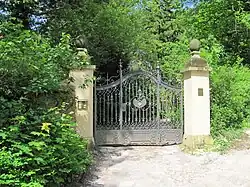 An der Südostecke des Grundstücks beginnt ein Weg, der zwischen dem Jägerberg und dem östlich gelegenen Grundstück des Ermelhauses auf den Berg führt, oberhalb des Ermelhauses nach Osten abknickt und durch den Fiedlergrund auf die Hochfläche von Wahnsdorf führt. Direkt auf der Ecke am Augustusweg liegt an diesem Bergpfad das östliche Tor, hinter dem die historische Zufahrt zu den Gebäuden liegt. Das aufwendige schmiedeeiserne Tor sitzt zwischen zwei mächtigen Pfeilern, die durch eine sandsteinerne Deckplatte sowie durch ein aufrechtstehendes Ovoid auf kräftigem Postament bekrönt wird.