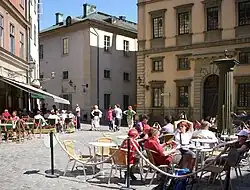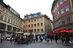 Der Platz ist dicht mit historischen Gebäuden umbaut. In den Erdgeschossen befinden sich mehrere Restaurants, die in den Sommermonaten auch die Fläche des Platzes selbst gastronomisch nutzen. Darunter auch das älteste, bereits 1785 nach Wiener Beispiel gegründete Cafe Stockholms, die Sundbergs konditori.[1] An der Südseite des Platzes befindet sich der einzige Supermarkt in Gamla stan.