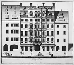 Die Leipziger Kaufmannsfamilie Jöcher besaß Ende des 17. Jahrhunderts ein Haus an der Nordostecke des Marktes in Verlängerung der Front des Alten Rathauses, getrennt durch das Salzgäßchen. Das 1695 errichtete Gebäude wurde 1707 durch den Architekten Johann Gregor Fuchs erweitert, wobei es die architektonische Form erhielt, die es über 200 Jahre beibehielt. Das fünfstöckige Gebäude besaß acht Fensterachsen. Schmale gequaderte Lisenen gliederten den Fensterbereich. Das Dach trug einen rechtwinkligen Dachaufbau mit vier Fensterachsen, der durch eine Balustrade mit Figurenschmuck gekrönt war. Der Fensterschmuck war sparsam gehalten. Besitzer des Hauses zur Umbauzeit war Johann Christoph Jöcher.[1]