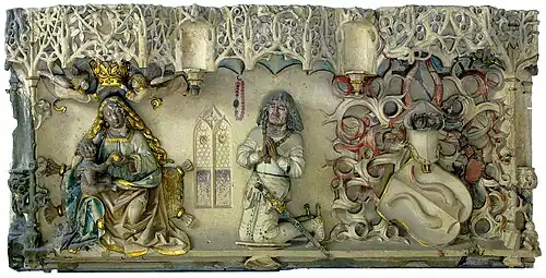 1489 stiftete Jörg von Sachsenheim für die Hospitalkirche, die nach der Stiftskirche zweitwichtigste Kirche in Stuttgart, einen Altaraufsatz aus weißem Sandstein.[16] Das Relief der Vorderseite ist farbig gefasst und stellenweise vergoldet. Es besteht aus drei Bildfeldern, die unter dem ornamentalen Astwerk eines gotischen Baldachins angeordnet sind: