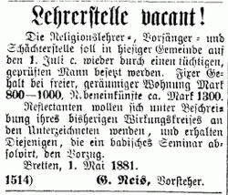 Die Schule befand sich in der Straße Engelsberg, wo auch die Synagoge und das Rabbinerhaus stand. Die jüdischen Elementarschulen wurden mit der Einführung der Simultanschulen im Großherzogtum Baden im Jahr 1876 aufgelöst. Die jüdische Schule in Bretten wurde bis in die 1920er Jahre als Religionsschule weitergeführt.
