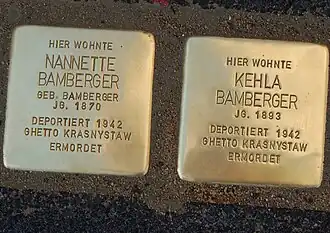 | Kehla Bamberger | 1893 – ?? | Tod im Ghetto Krasnystaw | Promenadestraße 17 | ||