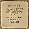 | Hedwig Haas | 1887–1942? | Hausfrau | Deportation in das Ghetto Krasnystaw, genauer Todesort und -zeitpunkt unbekannt | Hartmannstraße 5 |