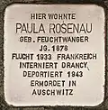 | Jeanette Adler | 1873 – ?? | Deportation in das KZ Theresienstadt, Tod vermutlich im KZ Auschwitz, genauer Todeszeitpunkt unbekannt | Hartmannstraße 5 |
