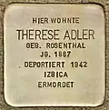 | Therese Adler, geb. Rosenthal | 1887 – ?? | Deportation in das Ghetto Izbica, Tod wahrscheinlich im Ghetto Krasnystaw, genauer Todeszeitpunkt unbekannt | Hartmannstraße 5 |