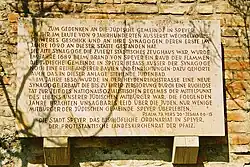 1968 wurde eine Gedenktafel zur Erinnerung an das Schicksal der jüdischen Gemeinde in der Mauer im Hof des Judenbades enthüllt. 1979, nach 40 Jahren, wurde eine weitere Gedenktafel an der rückwärtigen Wand des Kaufhofgebäudes (Platz der ehem. Synagoge) angebracht mit dem Text: Hier stand die Synagoge der Jüdischen Gemeinde Speyer bis zur Zerstörung durch die Nationalsozialisten in der Nacht vom 9. zum 10. November 1938. Direkt vor dieser Stelle wurde 1992 ein Mahnmal aufgestellt und wenig später auf den kleinen Platz (Parkplatz) gegenüber versetzt.[14] Ein Antrag der SPD im Jahre 2007, zur Erinnerung an Speyerer Juden kleine pflastersteingroße Gedenksteine, sogenannte Stolpersteine, im Gehweg vor den letzten Wohnstätten einzusetzen, fand im Stadtrat keine Mehrheit.[15]