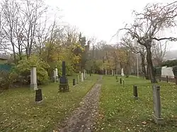 Neben dem Haupteingang ist in den Torpfeiler eine Tafel eingelassen mit folgender Inschrift: „Der Staub kehrt zurück/zur Erde, was er war,/der Geist aber/kehrt zu/Gott zurück, der ihn gegeben“. Auf dem Friedhof verläuft entlang der Friedhofsmauer ein 2 m breiter unbefestigter Weg und ein weiterer 1,5 m breiter unbefestigter Weg teilt die Anlage in der Mitte.