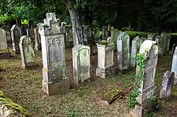 Während der Zeit des Nationalsozialismus sollte die politische Gemeinde den jüdischen Friedhof nicht nur erwerben, sondern auch einebnen und landwirtschaftlich nutzen. So wurde 1944 zwar mit der Reichsvereinigung der Juden in Deutschland ein Kaufvertrag abgeschlossen, dieser aber nicht im Grundbuch eingetragen. Sogar das schmiedeeiserne Tor wurde weder abmontiert noch einer Verwertung für Rüstungszwecke zugeführt, wie es befohlen worden war.[2] Allerdings wurden nach Zeitzeugenberichten Grabsteine umgeworfen... Nach Kriegsende mussten aktive NS-Unterstützer und -Unterstützerinnen (zum Beispiel aus der NS-Frauenschaft) aus der Umgebung die umgeworfenen Grabsteine wieder aufrichten. In den 1950er Jahren wurde der Friedhof von Gestrüpp befreit und mit Waldbäumen bepflanzt.