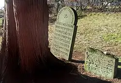 Materialien, Formen und Inschriften der Grabsteine reflektieren die Chronologie des Orts. Die älteren Steine aus der Zeit bis in das späte 19. Jahrhundert sind überwiegend aus Sandstein in hochrechteckiger Form, oberseitig mit traditionellem Rundbogenabschluss.[12] Ihre Beschriftung ist bis zur Jahrhundertmitte nur in Hebräisch, dann beginnen sich kurze Angaben in deutscher Sprache auf der Rückseite zu ergänzen.[13] Zum Jahrhundertende wechselt das Deutsche auf die Vorderseite, sich dort zunächst noch der hebräischen Inschrift unterordnend.[13] Die Grabsteine dazu sind aus poliertem Granit und von zunehmend mannigfaltiger Form, besonders häufig mit Obeliskenmotiv.[12] Das Hebräische wandert hinab zum Sockel des Steins oder auf dessen Rückseite, zum Teil wird es ganz aufgegeben.[13]