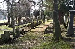 Ein mittlerer Stufenweg teilt die Friedhofsfläche in etwa zwei Hälften. Die südwestliche (vom Eingang rechts) wird von einem älteren Gräberfeld eingenommen, die nordöstliche von einem neueren.[10] Unmittelbar am Weg und in Eingangsnähe sind Gräber von herausragenden Gemeindemitgliedern angeordnet, darunter Gemeindevorsteher aus mehreren Generationen der Familie Meyer (vgl. unten).[11]