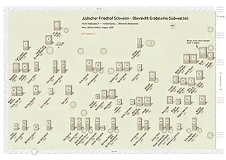 1988 erstellte Adalbert Böning aus Hagen eine Übersetzung von 18 hebräischen Inschriften ausgewählter Grabsteine.[29] Im gleichen Jahr veröffentlichte der Schwelmer Stadtarchivar Gerd Helbeck eine Liste der Namen und Lebensdaten aller noch lesbaren und übersetzten Grabinschriften des Friedhofs (96 benannte Personen).[30] 2017 entstand in ehrenamtlicher Arbeit ein Friedhofsplan, der auch online veröffentlicht ist (vgl. unten).