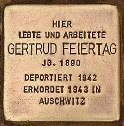 - ↑ T. Lähns: Stolperstein für Gertrud Feiertag Hauptausschuss für Gedenkplatte in Caputh. In: Potsdamer Neueste Nachrichten vom 5. Dezember 2008.