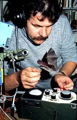 „Moderne Technik und unkonventionelle Ideen ermöglichen dem Präparator am Baseler Museum Einblicke in das Werben und Paaren der mausköpfigen Fledertiere, die so bislang keinem Verhaltensforscher vergönnt waren.“[5] Ein 1992 in der Station „Hofmatt“ geborenes Fledermausmännchen stattete Gebhard mit einem Halsbandsender aus und verfolgte es mit Richtantennen in seinen Bewegungen. Diese telemetrischen Daten dokumentierte er.[6]