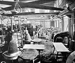 Das fertige Produkt wurde in den dazu bestimmten Verpackungsräumen sorgfältig verpackt (für den Überseetransport in Blechkisten oder Öltuch) und zum Versand gebracht. Die Firma besaß ihre eigene mechanische Tischlerei, Schlosserei, Drechslerei, Formengießerei sowie Kartonagenerzeugung und Druckerei. Im Betrieb standen sieben Dampfkessel, für die der jährliche Kohlenverbrauch (vor 1900) 500 Waggons betrug, fünf Dampfmaschinen mit 350 PS, fünf Dynamomaschinen für die elektrische Beleuchtung der Anlage und außerdem noch eine eigene Ölgaserzeugung. An Arbeits- und anderen Hilfsmaschinen gab es 386 Stück.