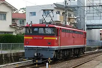 Fünf EF67-100 wurden ab 1990 aus Spenderlokomotiven der 6. Serie der Baureihe EF65-0 aufgebaut, um die alternden EF61-200-Schublokomotiven zu ersetzen. Dieser Fahrzeugpark wurde in den Jahren 2003 und 2004 überholt. Dabei wurden die Lokomotiven in einem neuen Farbschema mit grauen und weißen Linien entlang der unteren Lokkastenseite lackiert.[1] Diese Lokomotiven waren ursprünglich mit Scherenstromabnehmern des Typs PS22B ausgestattet, welche bei Überholungen gegen Einholmstromabnehmer ausgetauscht wurden. Dennoch fahren die Maschinen heute wieder mit den PS22B-Scherenstromabnehmern.